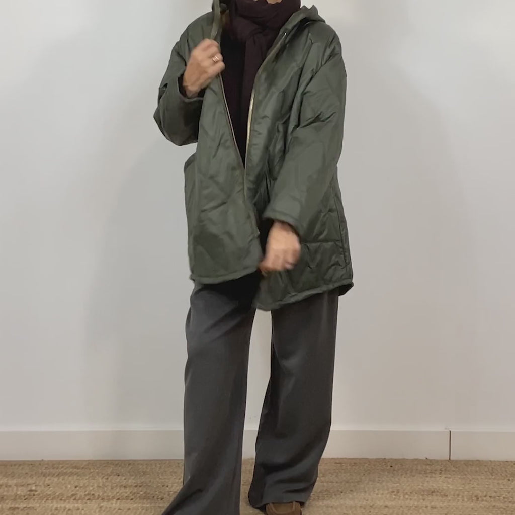 Abrigo acolchado con capucha, no extraíble. Cierre con cremallera. Dos bolsillos frontales y un bolsillo en el pecho con cremallera. Composición: 100% poliéster, exterior e interior.