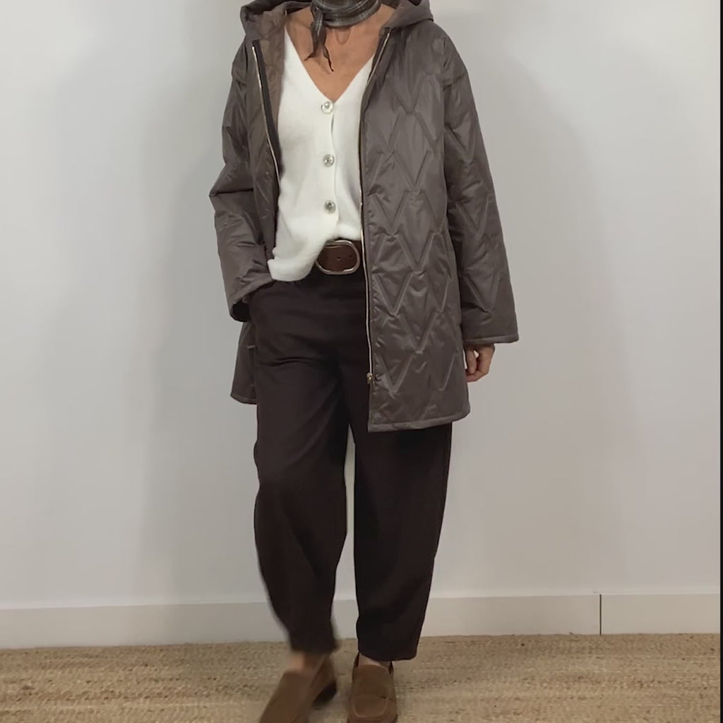 Quilted coat with hood, not removable. Zipper closure. Two front pockets and one chest pocket with zipper. Fits from size 36 to 44. Composition: 100% polyester, exterior and interior.