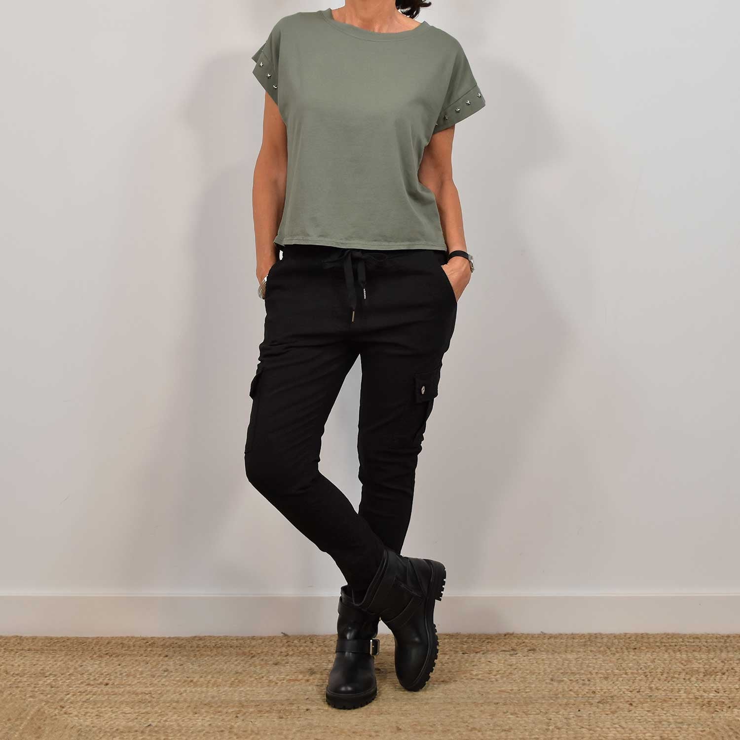 Adjustable waist tie. Cargo. Inspired silhouette with utility pockets throughout for added dimension. One size. Fits from 36 to 40-42. Composition: 75% viscose, 22% nylon and 3% elastane.