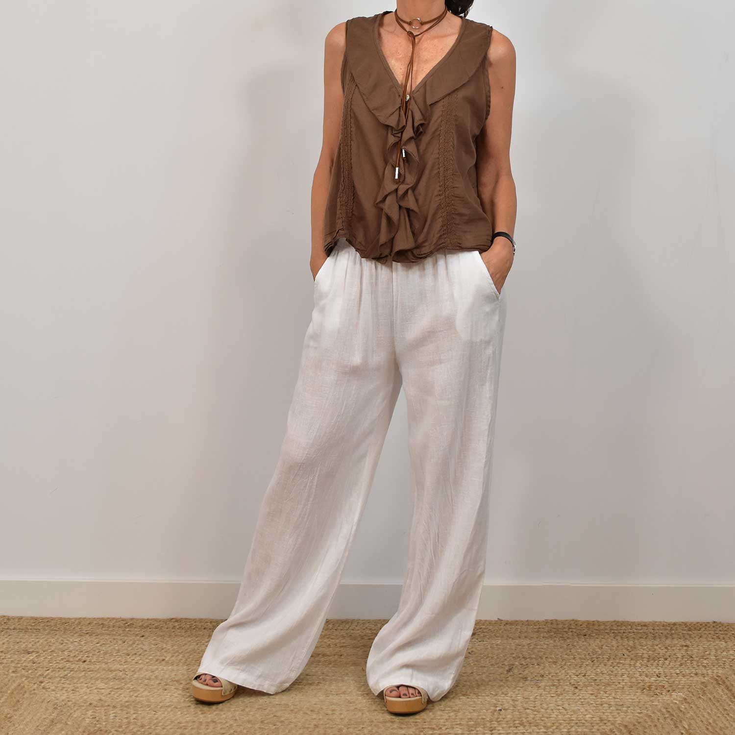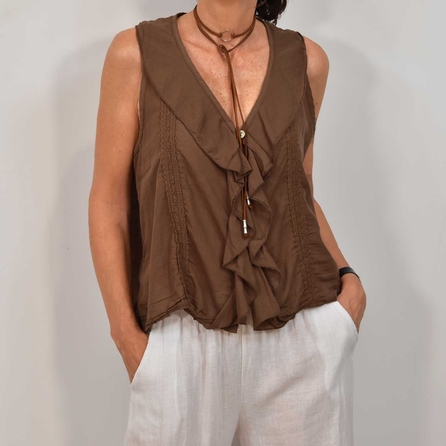 CAMISETA CUELLO VOLANTE MARRÓN