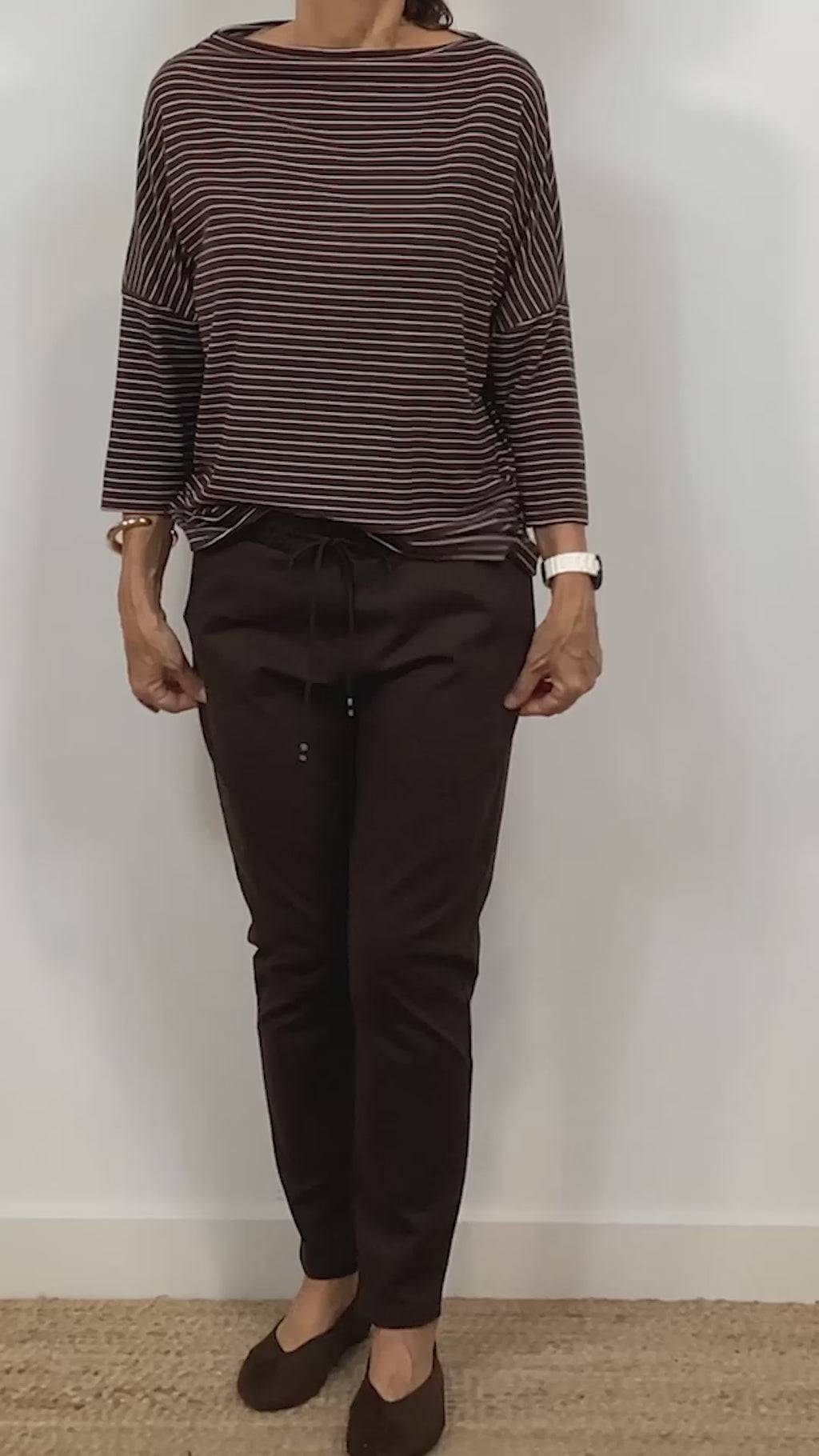 Pantalón de tejido punto roma. Cinturilla elástica con cordón ajustable. Bolsillos laterales. Composición: 65% viscosa, 29% poliamida y 5% elastano.