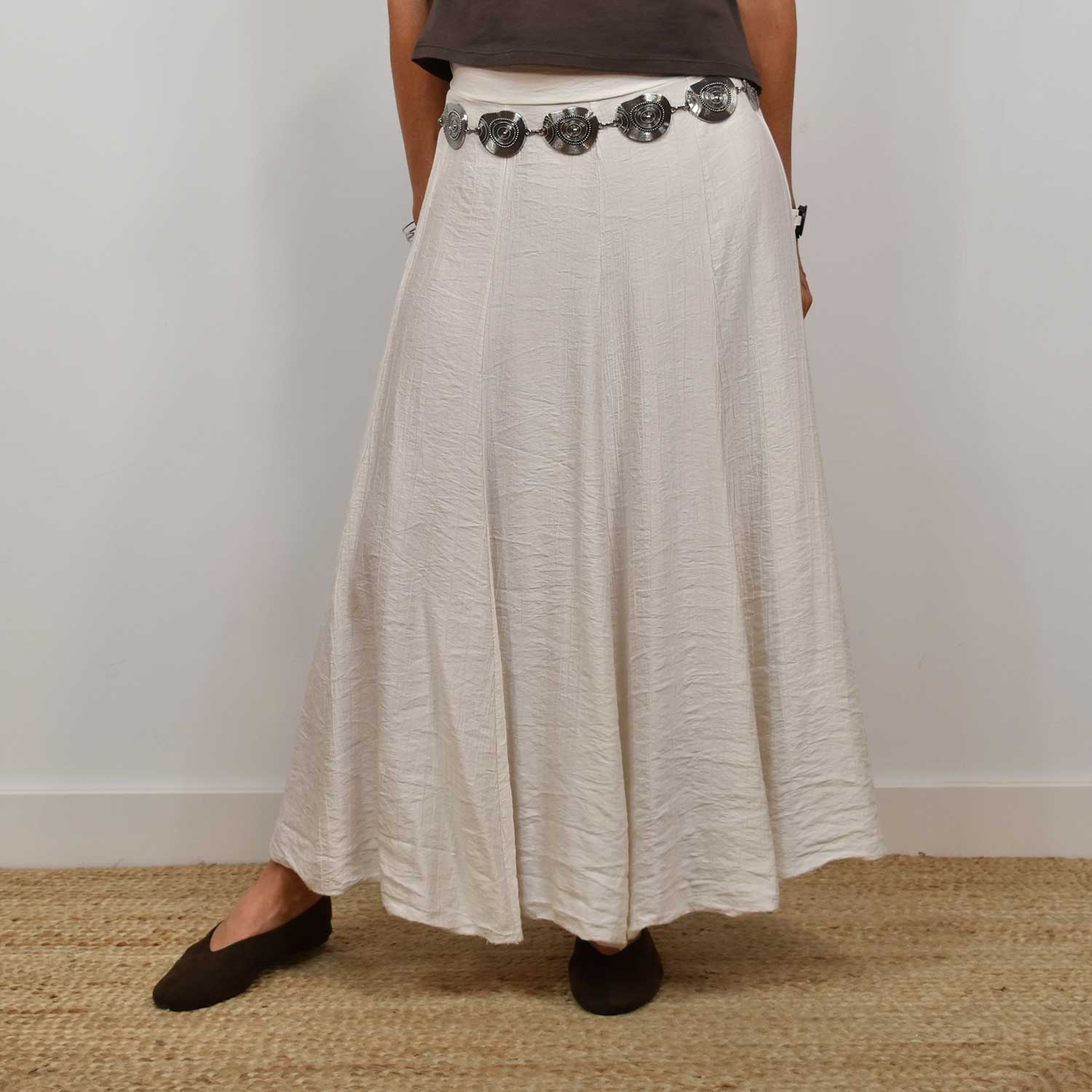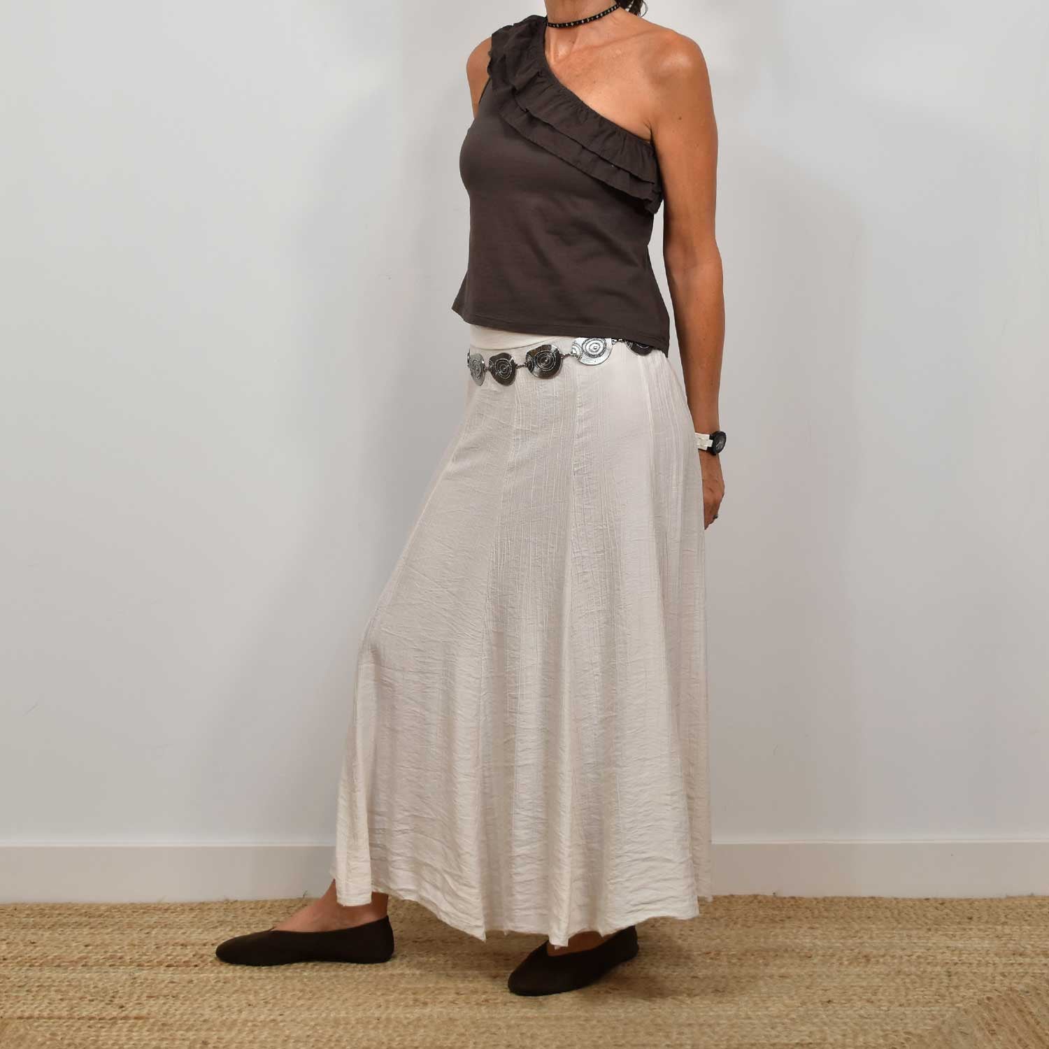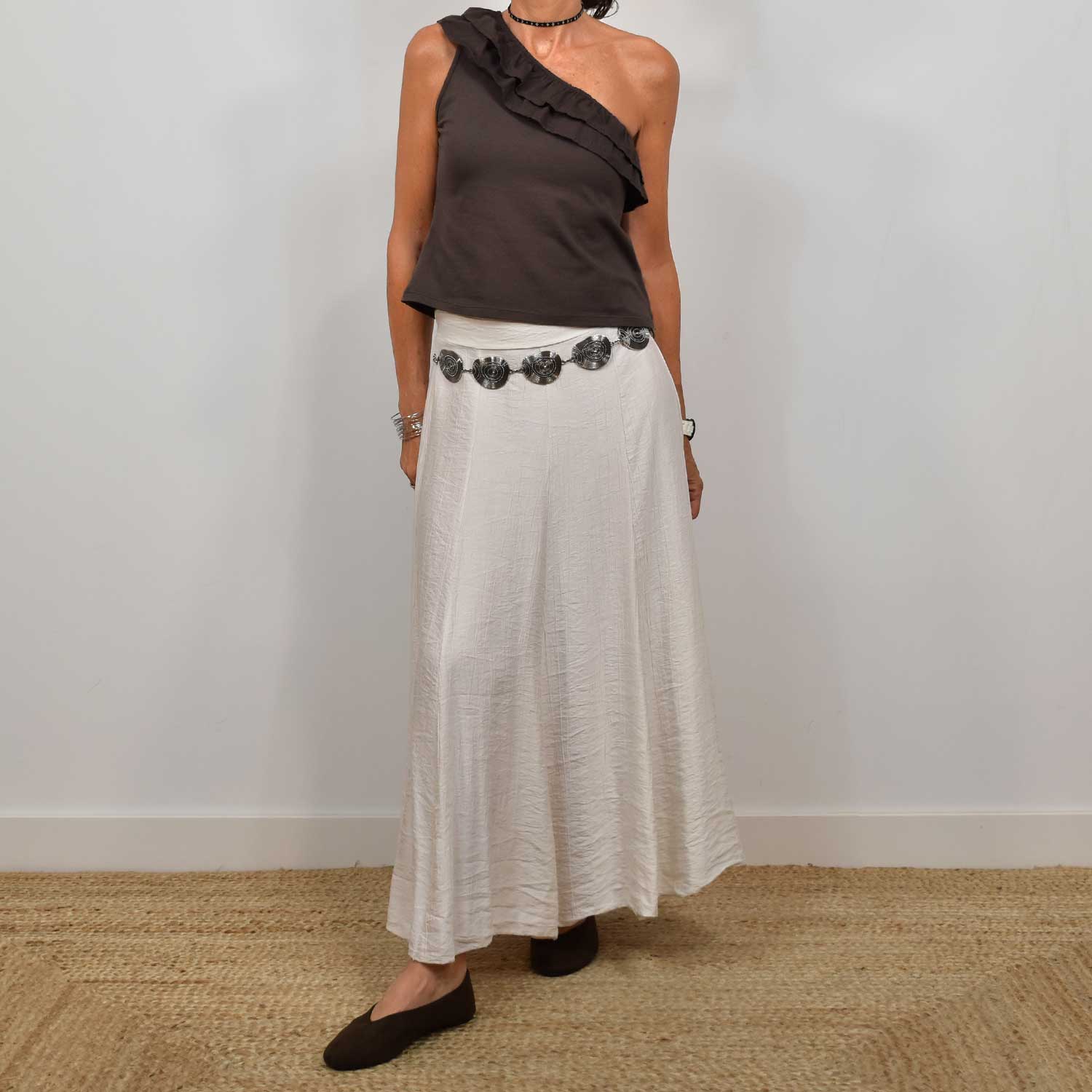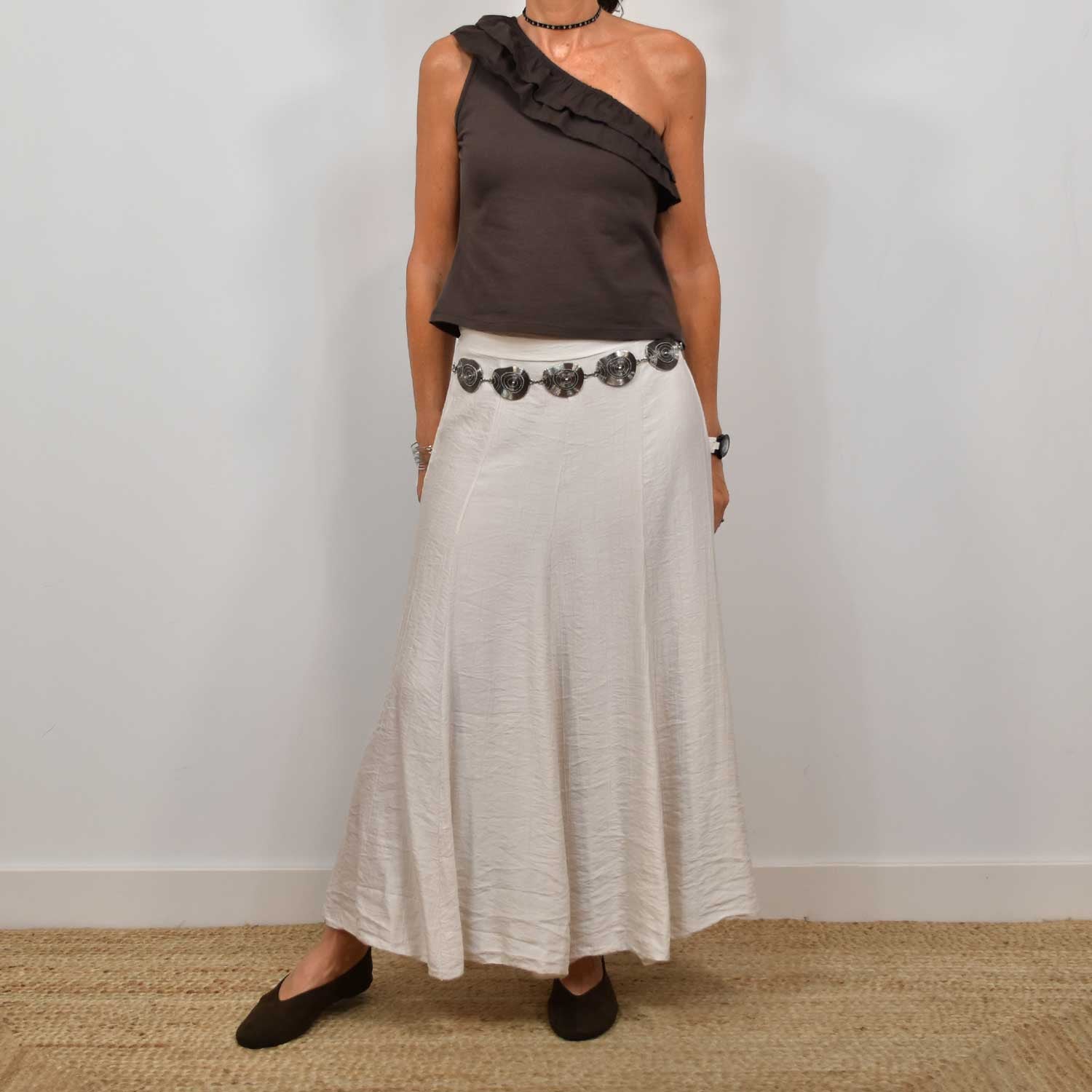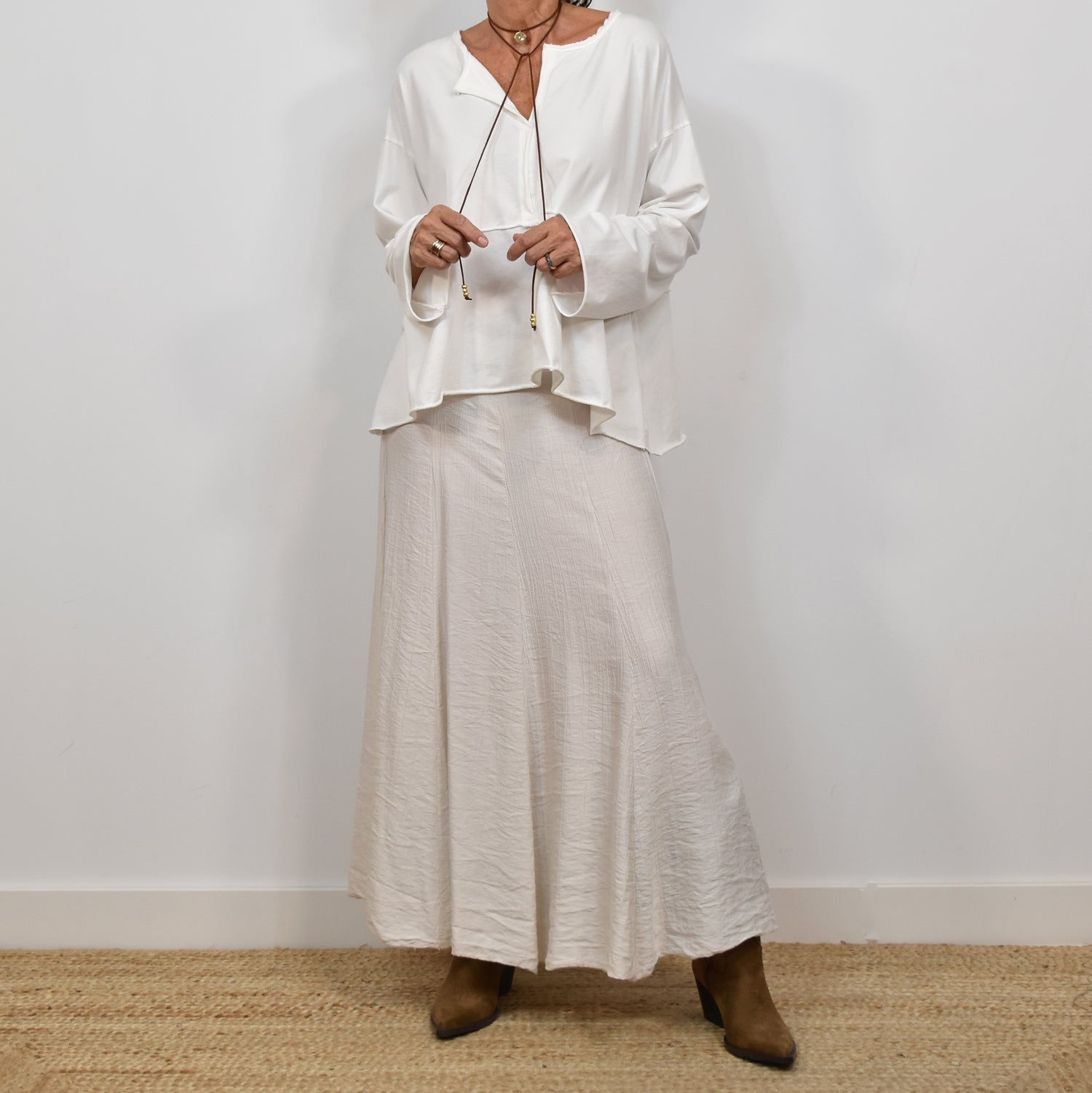 La mannequin mesure 164 cm et porte une taille 36/S pour les jupes.