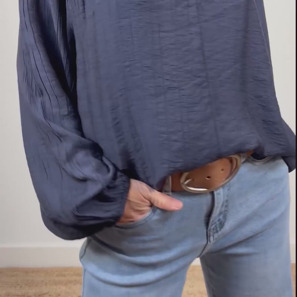Blusa de manga larga abullonada con puño elástico. Cuello mao. Composición: 87% viscosa y 13% poliamida.  Talla única adaptable desde la 36 hasta la 44.